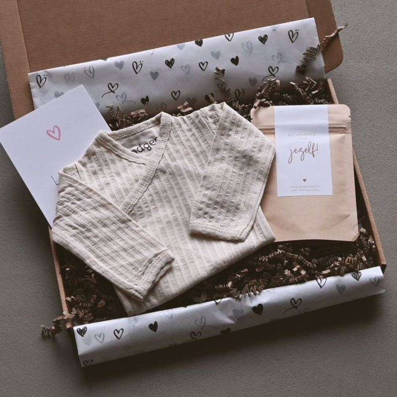 Met de zachte overslagromper geef je alvast iets fijns voor de baby, terwijl het badzout uitnodigt tot een ontspannen moment voor mama zelf. Juist die combinatie maakt dit een lief babypakket dat klein oogt, maar toch heel attent en feestelijk voelt.